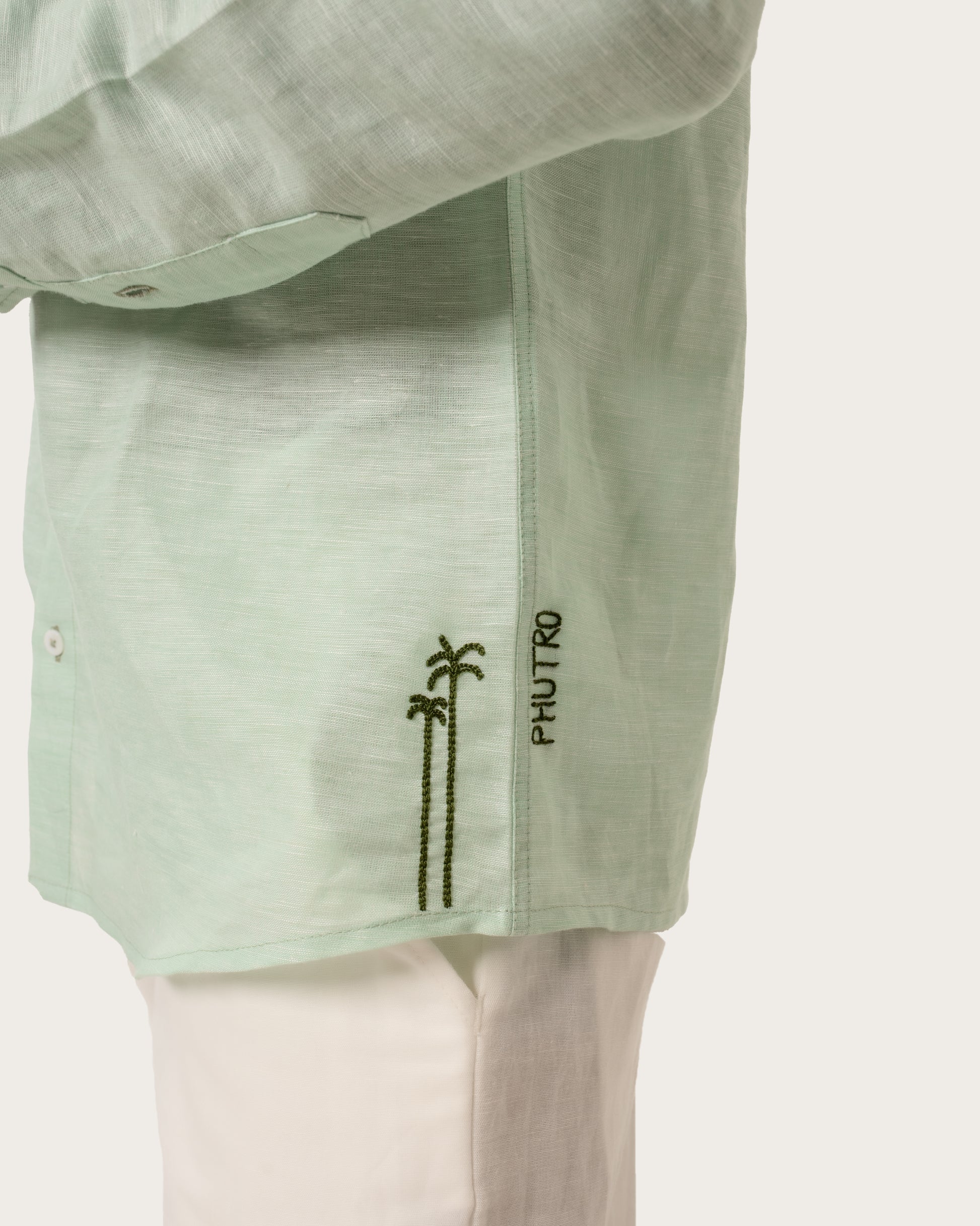 THIS Hand-embroidered linen shirt crafted by skilled artisans in PHUTRO WORKSHOP, taking several days to complete. The process begins with preparing the soft, breathable linen fabric, followed by carefully marking the design by hand. Using traditional techniques, artisans embroider each motif stitch by stitch, often spending hours a day to ensure precision and beauty. The result is a one-of-a-kind shirt that showcases craftsmanship and attention to detail.