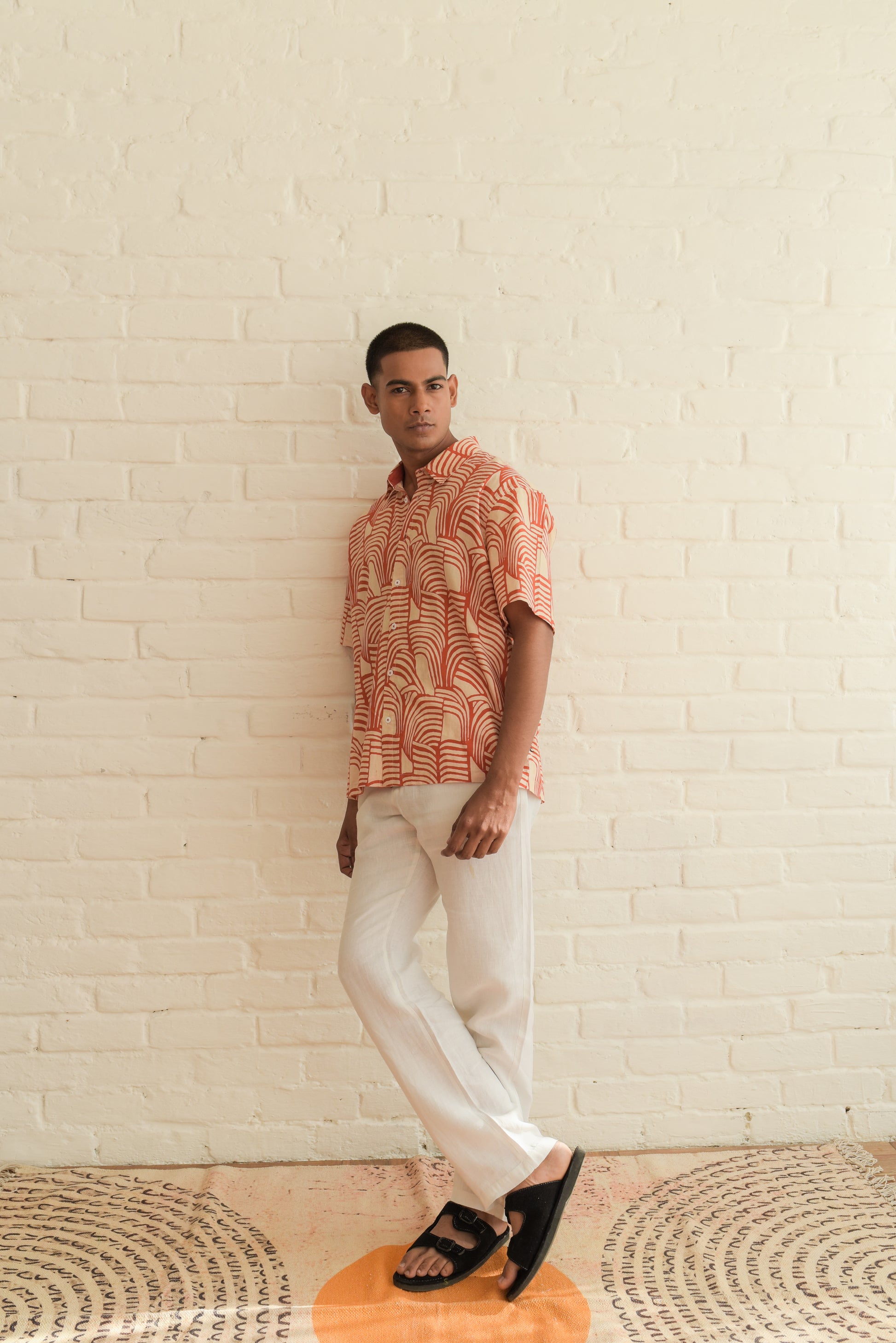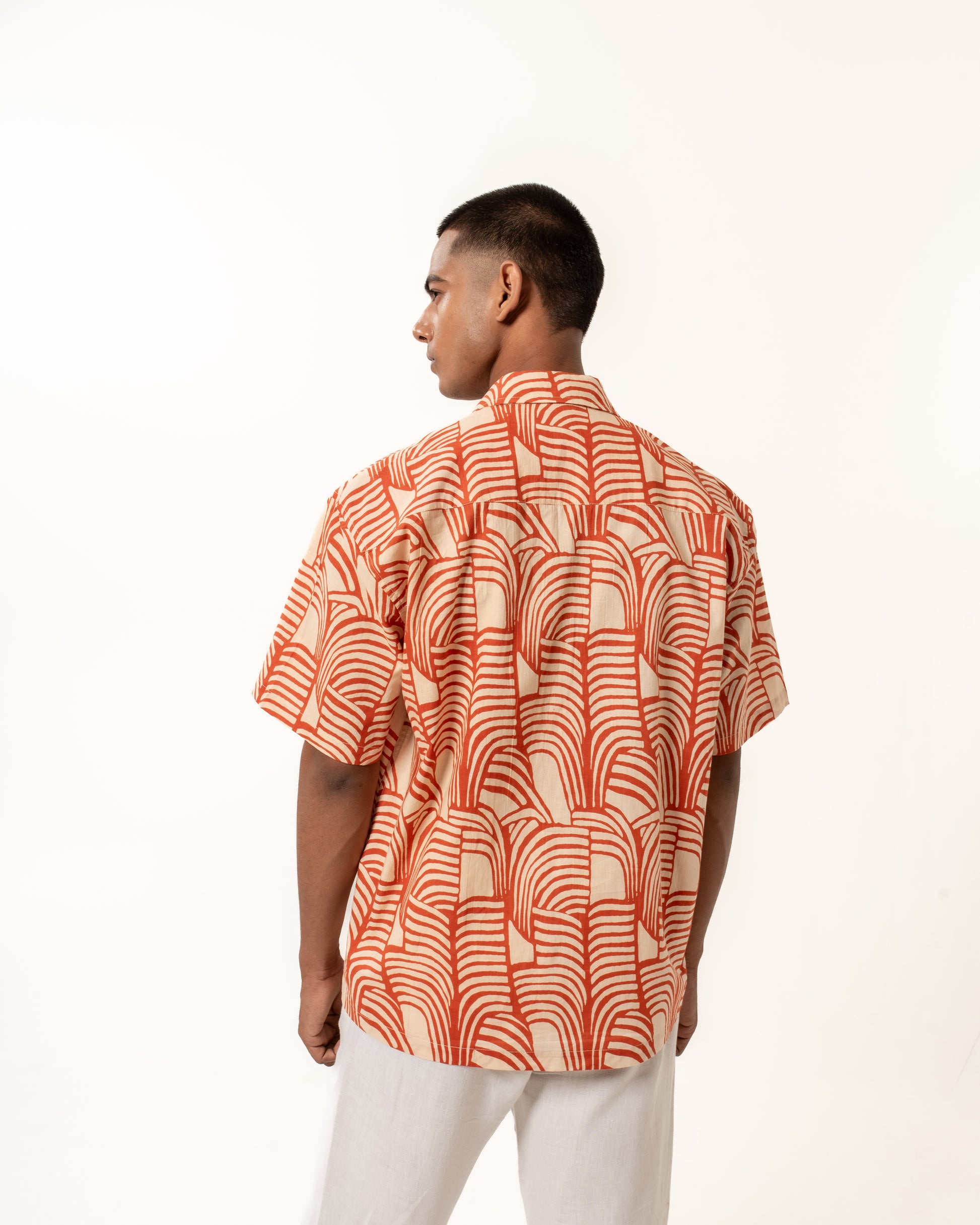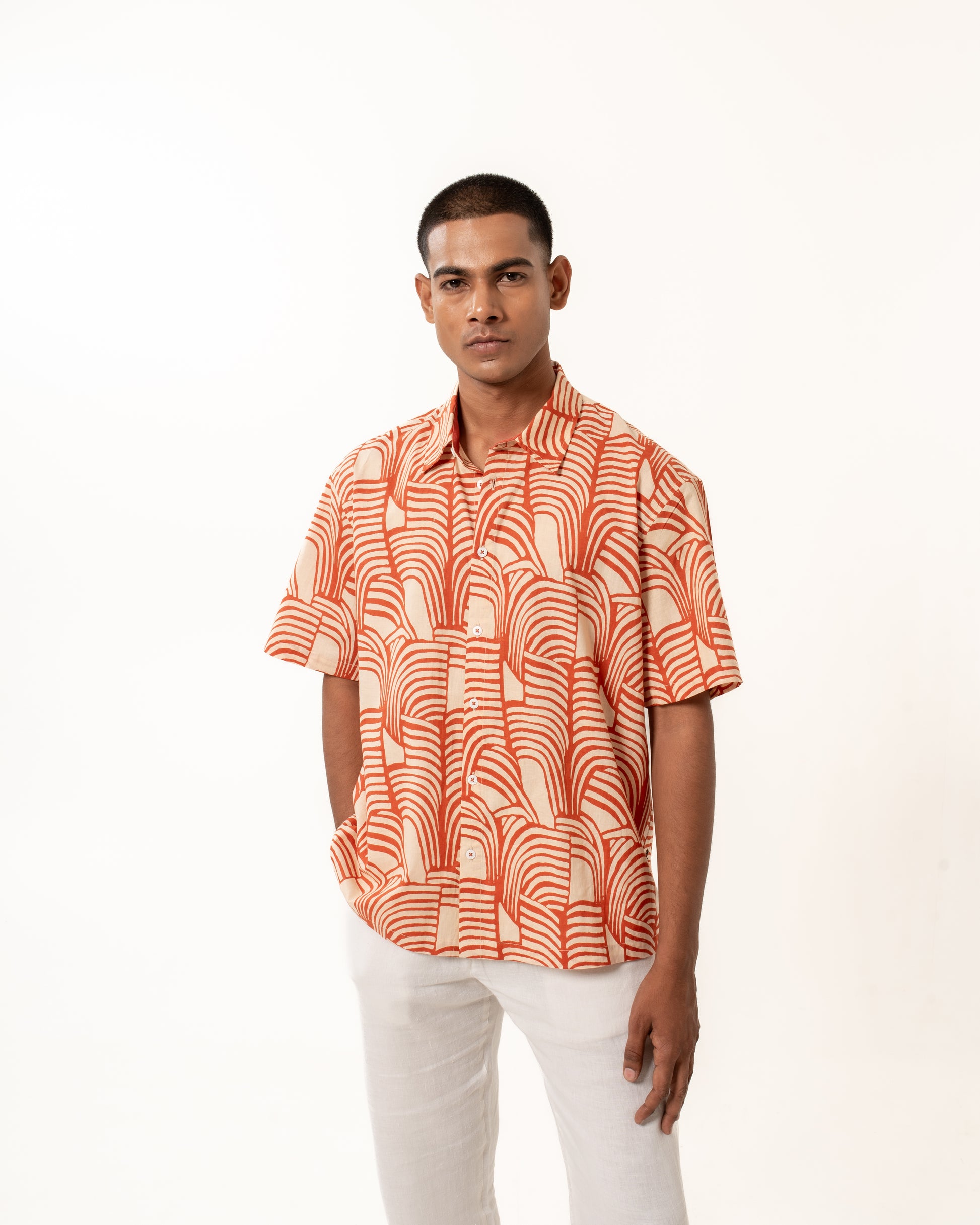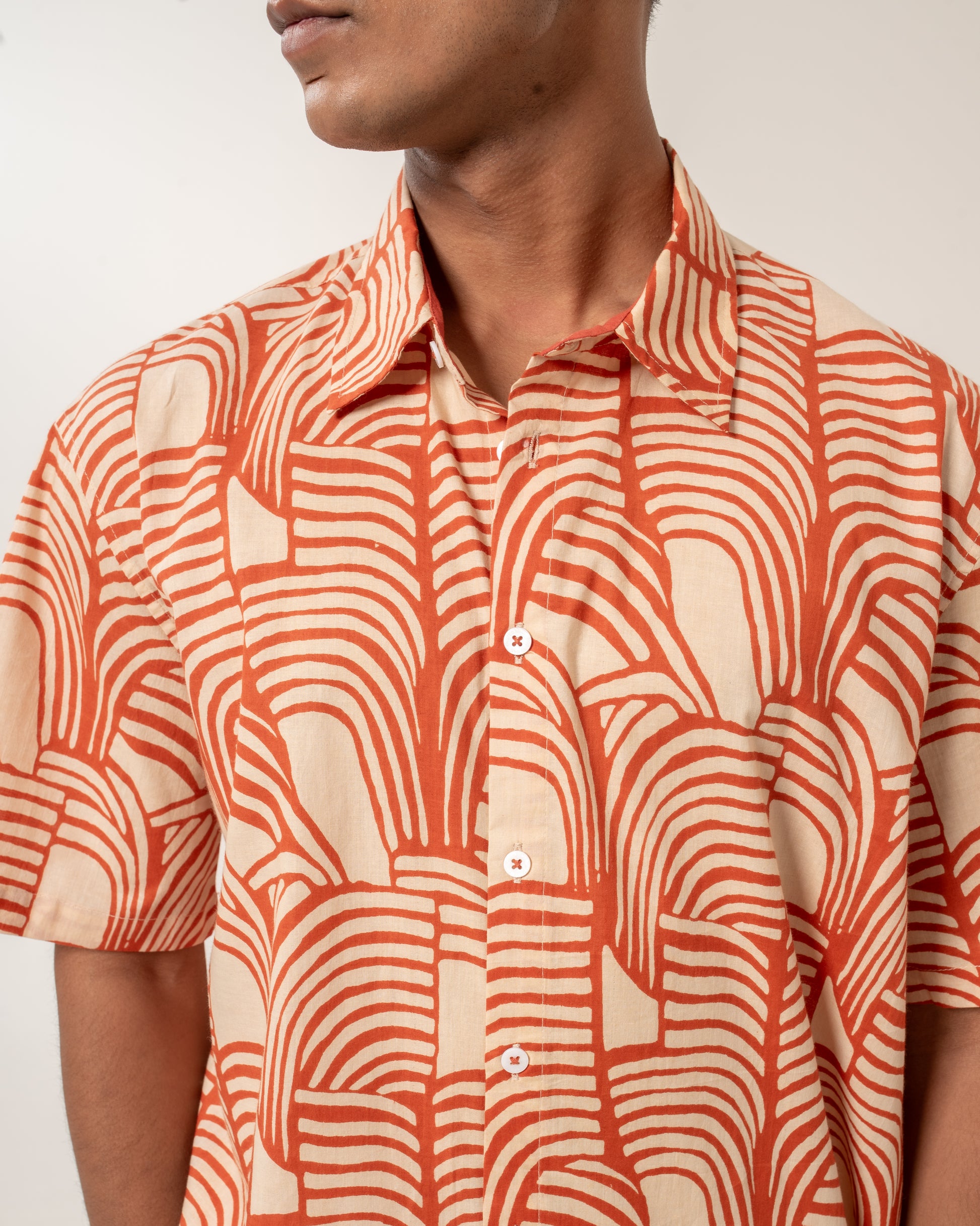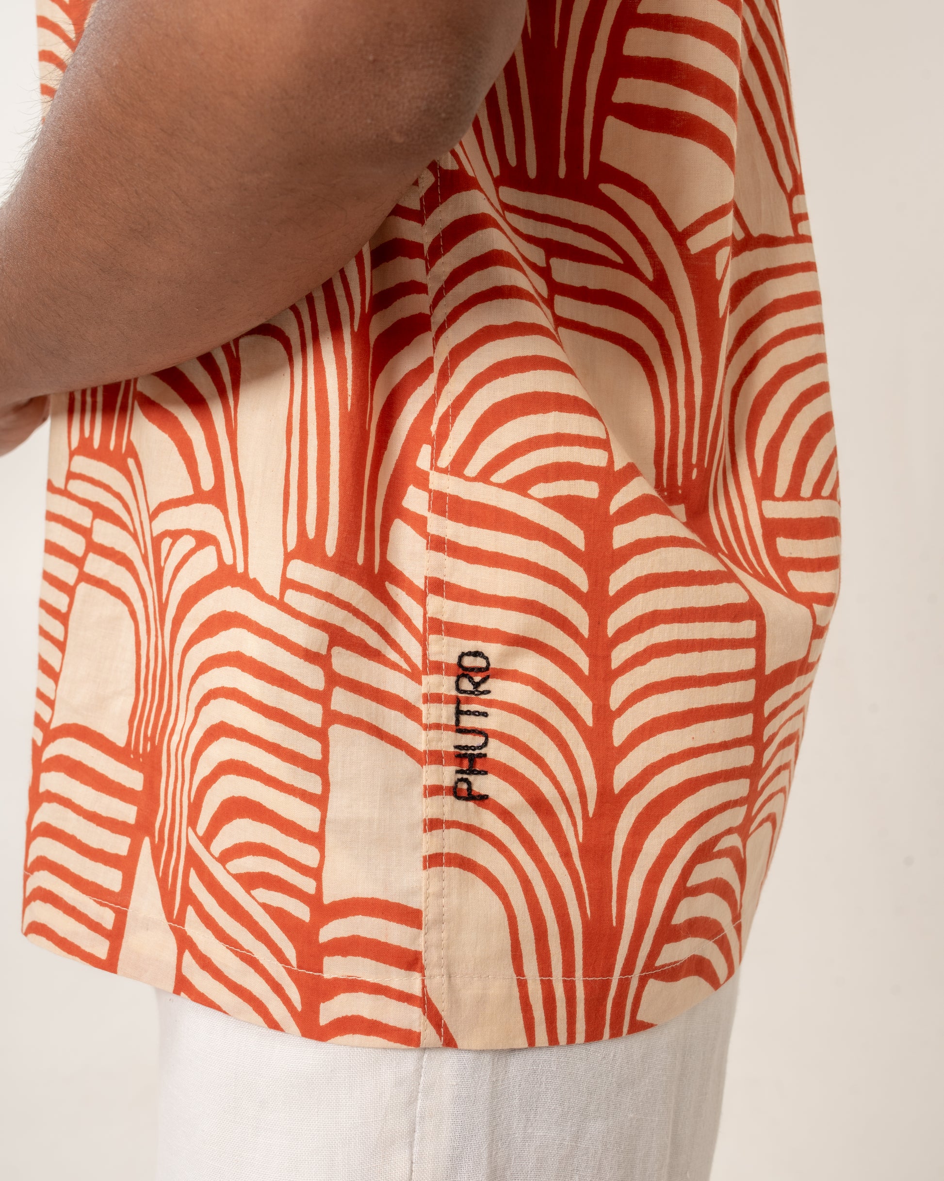 This shirt is made from soft organic cotton and features hand block printing. Each design is stamped onto the fabric using hand-carved wooden blocks, giving it a unique, artisanal touch. The natural cotton fabric is both eco-friendly and comfortable, making this shirt a perfect blend of craftsmanship and sustainability.