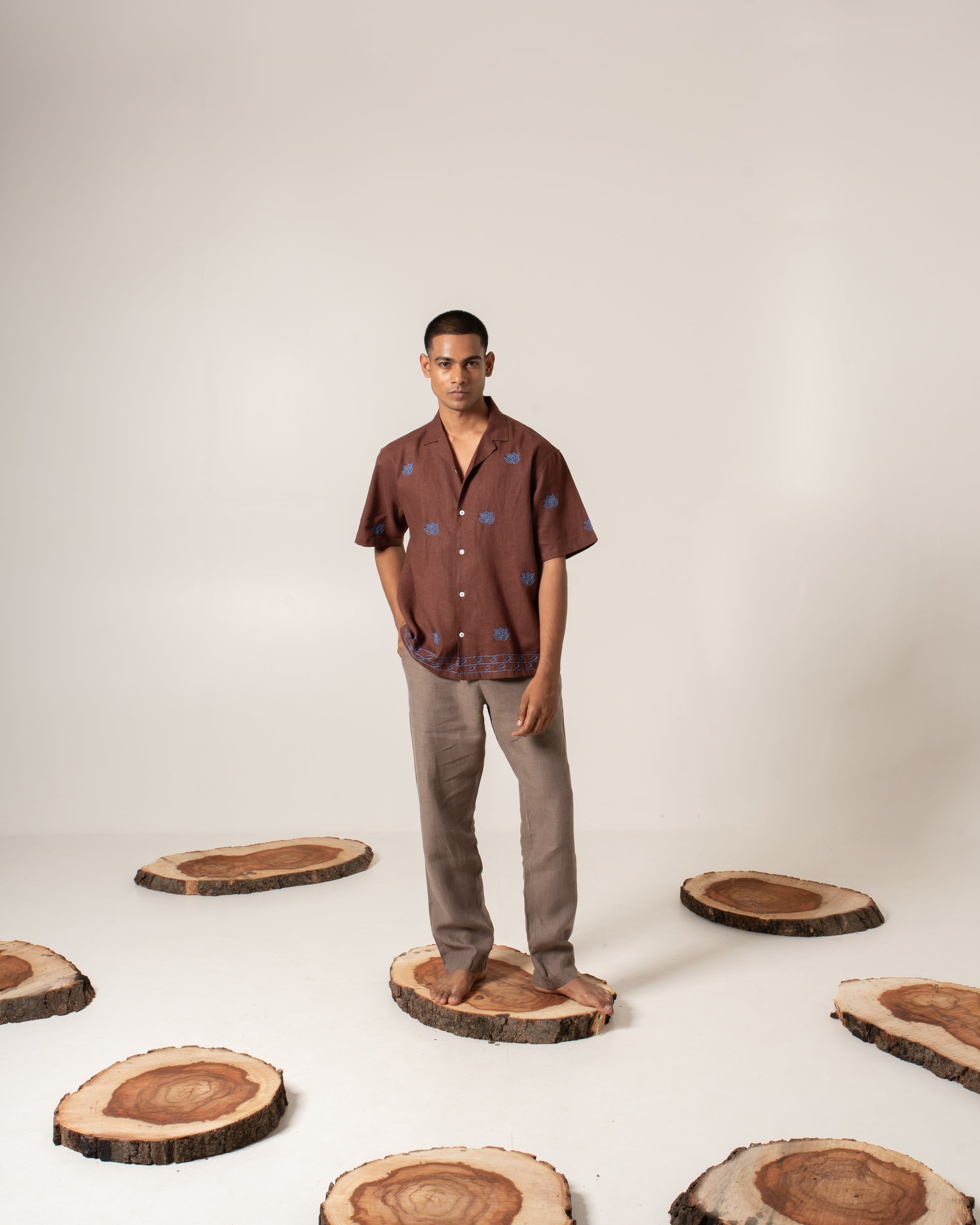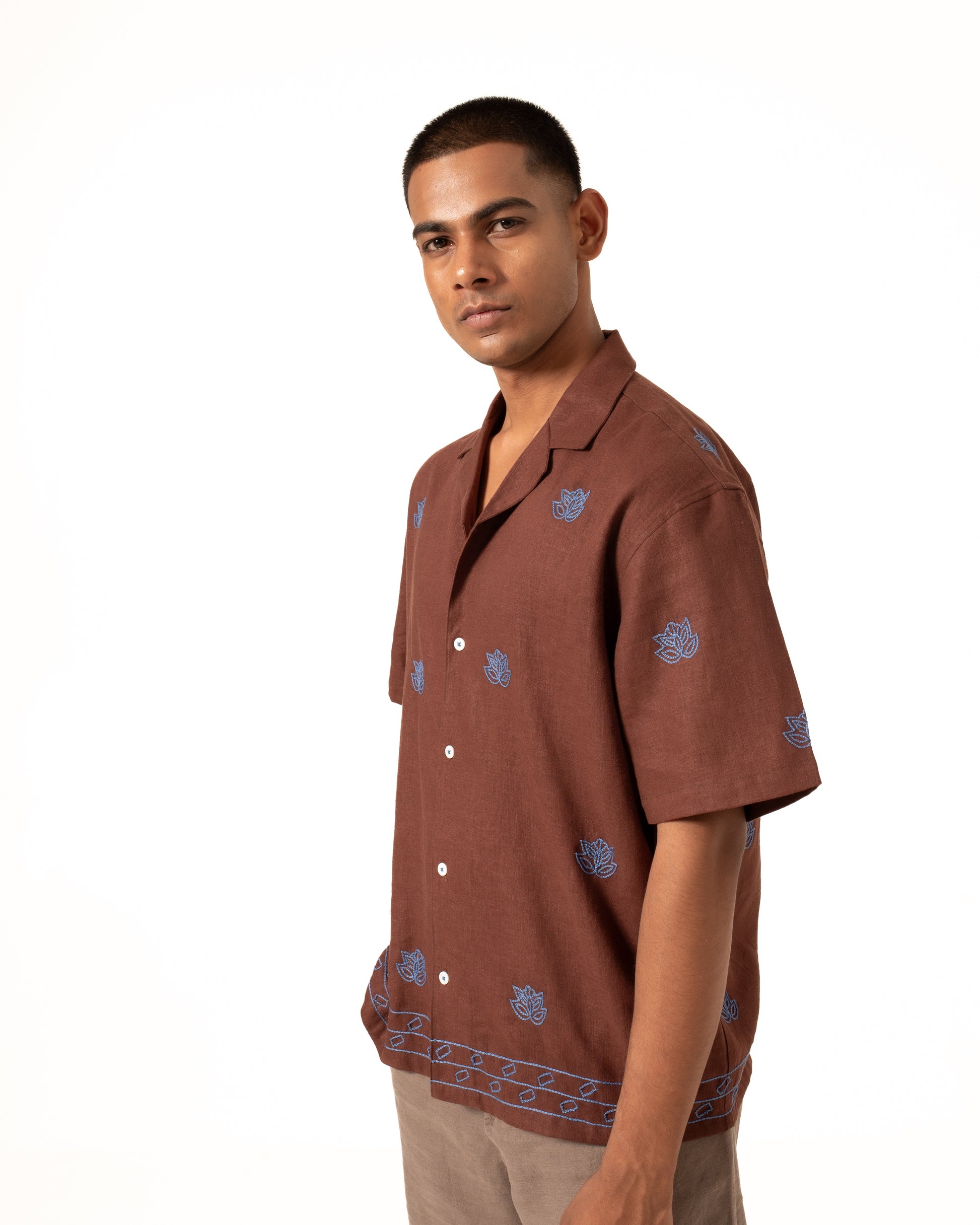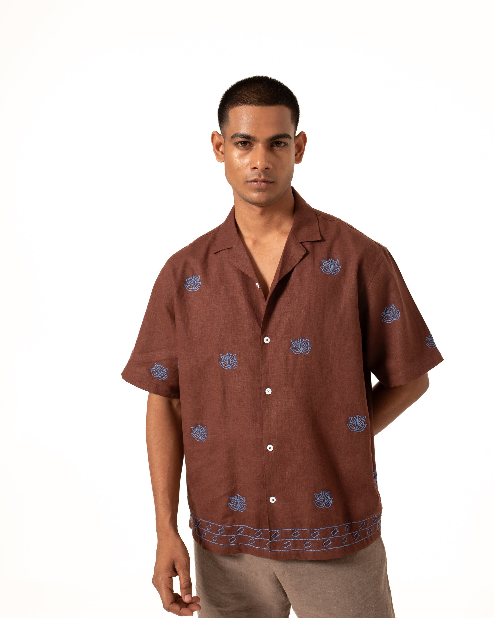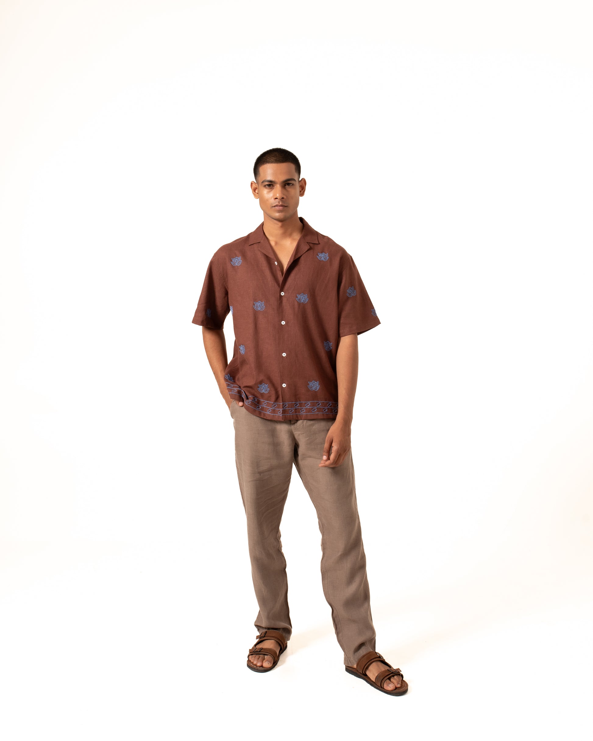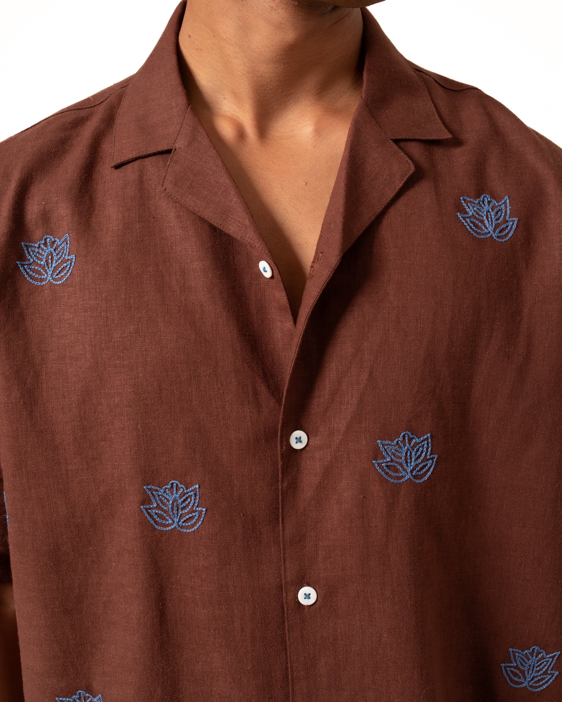 LINEN HAND EMBROIDERED BOWLING HALF SLEEVE SHIRT
