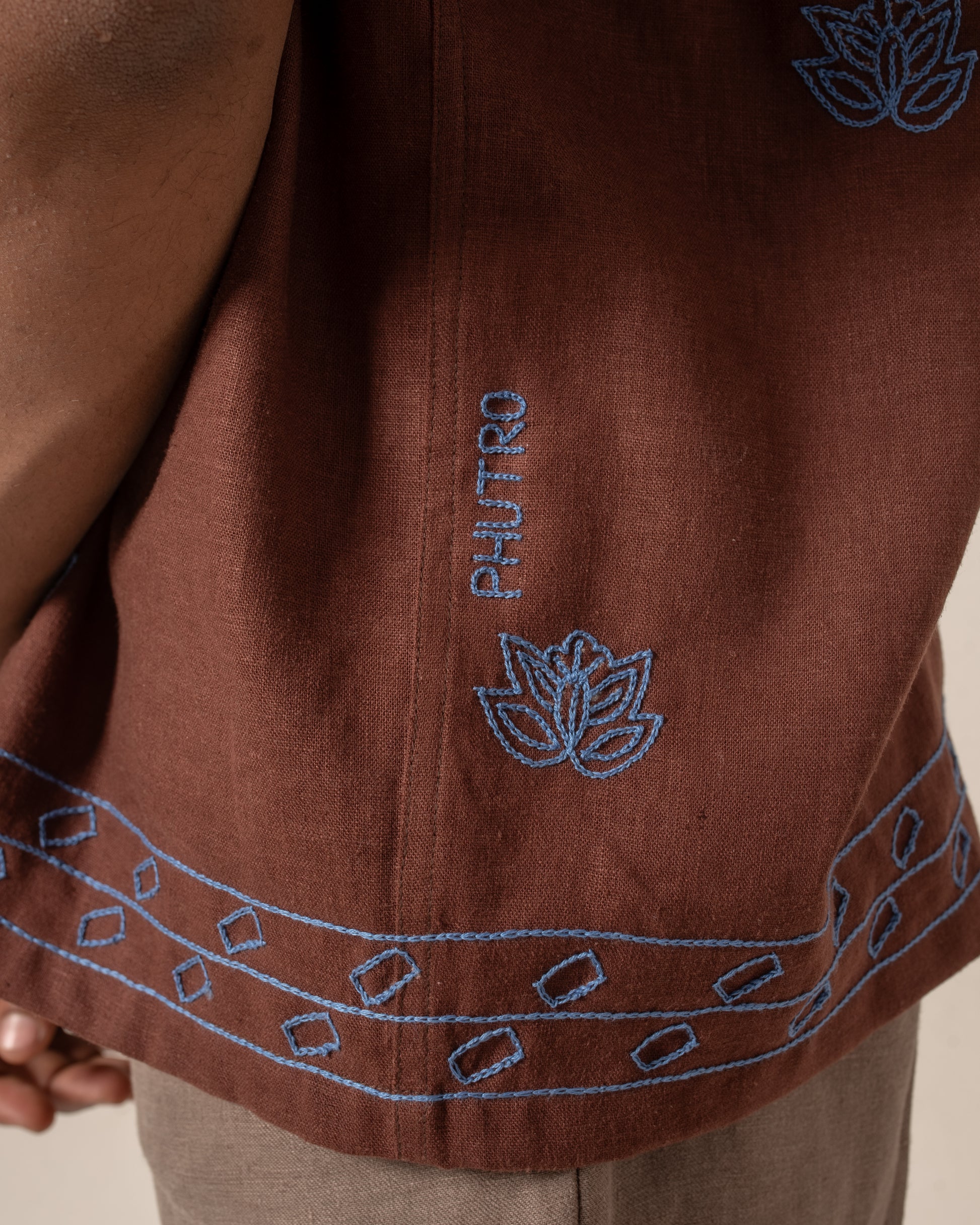 THIS Hand-embroidered linen shirt crafted by skilled artisans in PHUTRO WORKSHOP, taking several days to complete. The process begins with preparing the soft, breathable linen fabric, followed by carefully marking the design by hand. Using traditional techniques, artisans embroider each motif stitch by stitch, often spending hours a day to ensure precision and beauty. The result is a one-of-a-kind shirt that showcases craftsmanship and attention to detail.