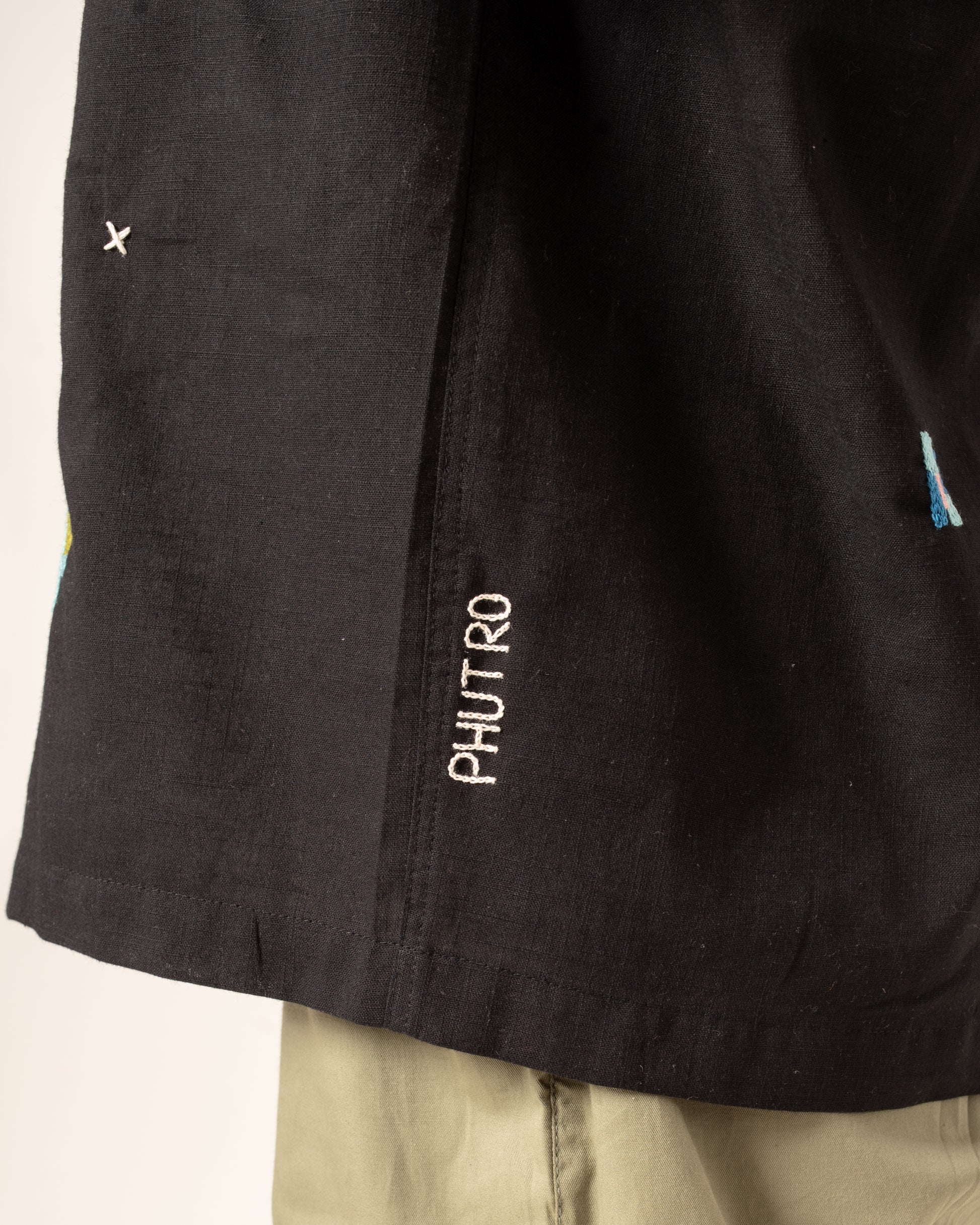 This hand-embroidered organic cotton shirt is crafted by skilled artisans at the Phutro Workshop, taking several days to complete. The process begins with preparing the soft, breathable organic cotton fabric, followed by hand-marking the design. Using traditional techniques, artisans embroider each motif stitch by stitch, dedicating hours a day to ensure precision. The result is a one-of-a-kind shirt that showcases craftsmanship and attention to detail.