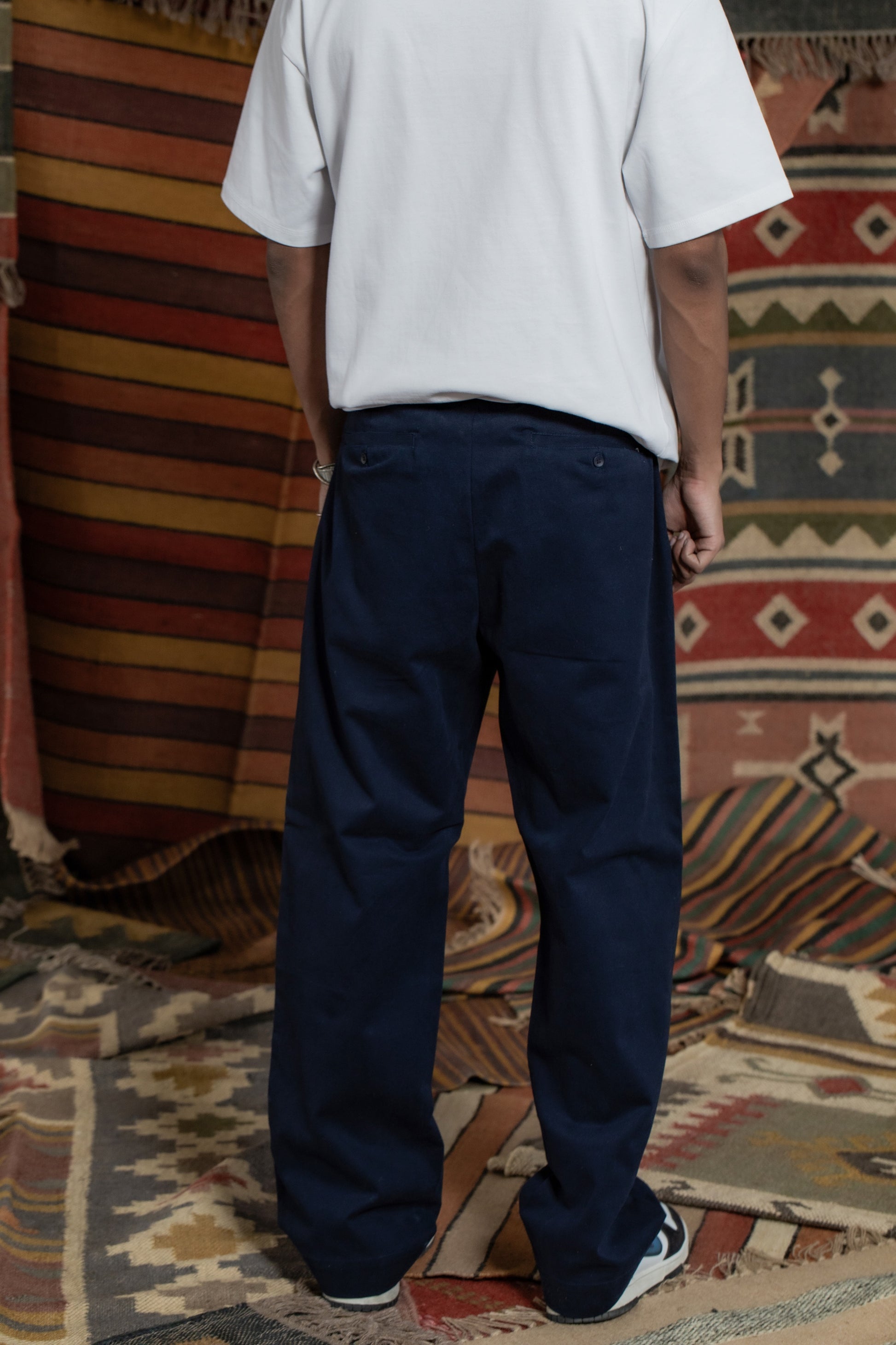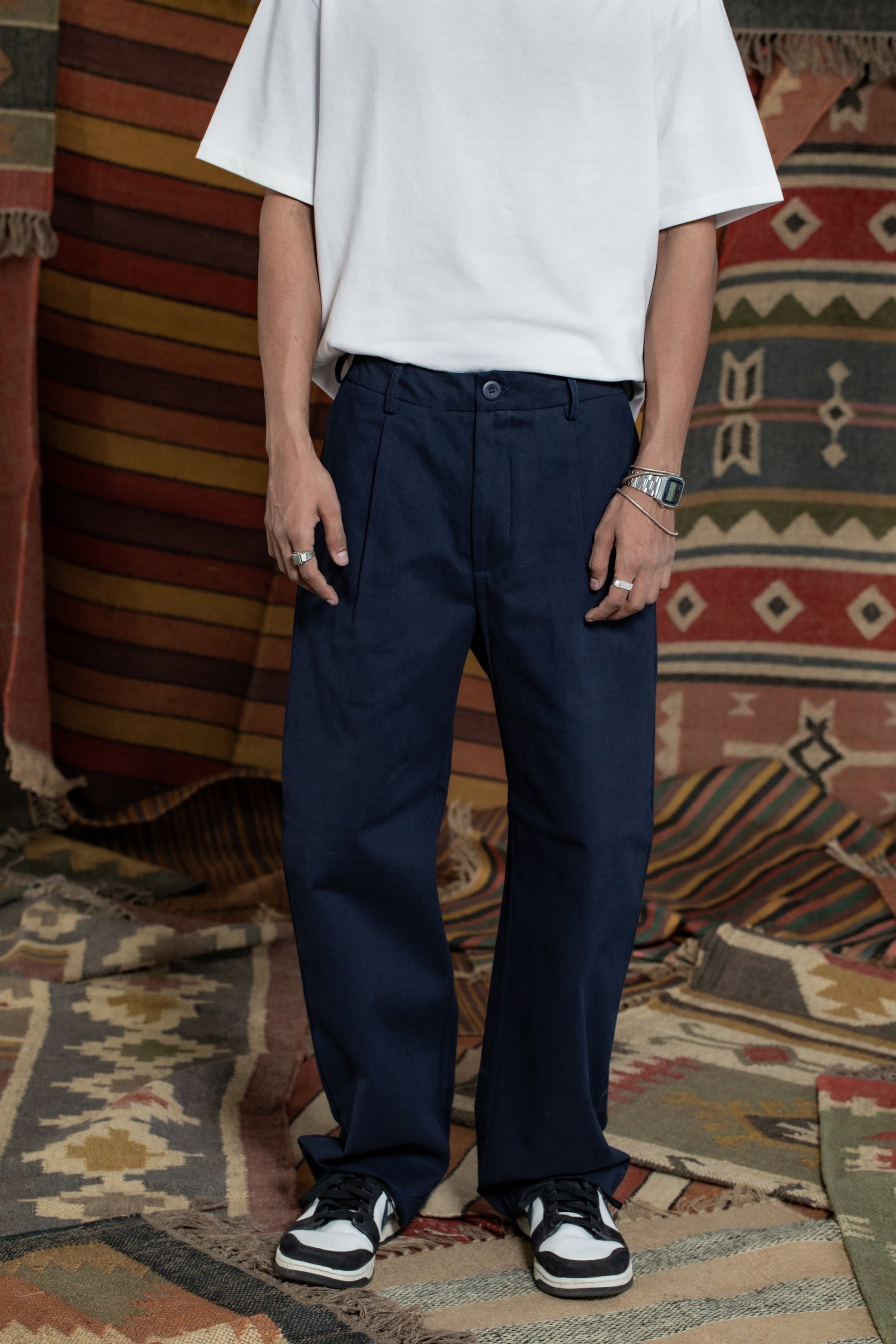 These wide, straight-cut pleated pants. Crafted from organic cotton twill, they offer an elegant drape and timeless appeal.