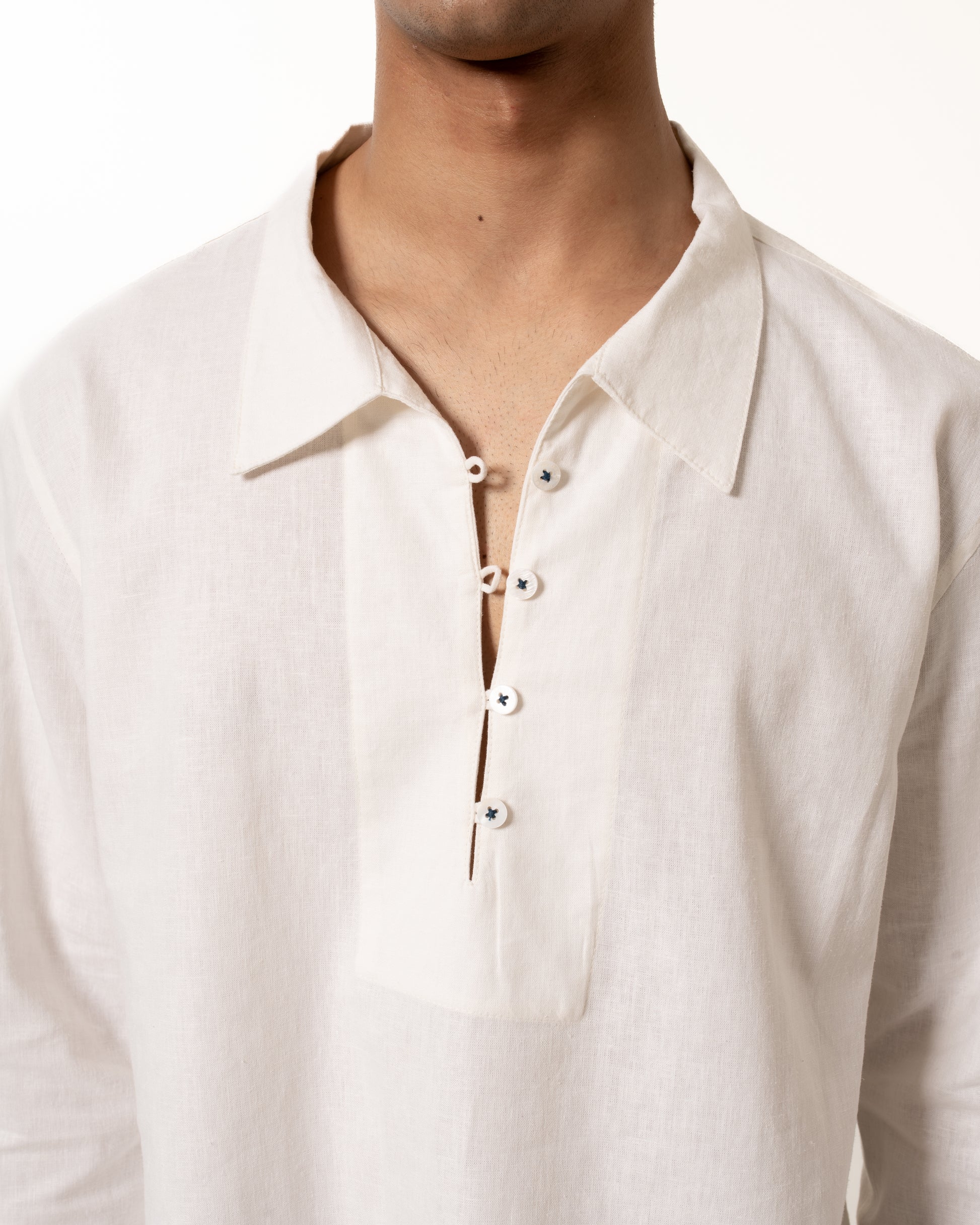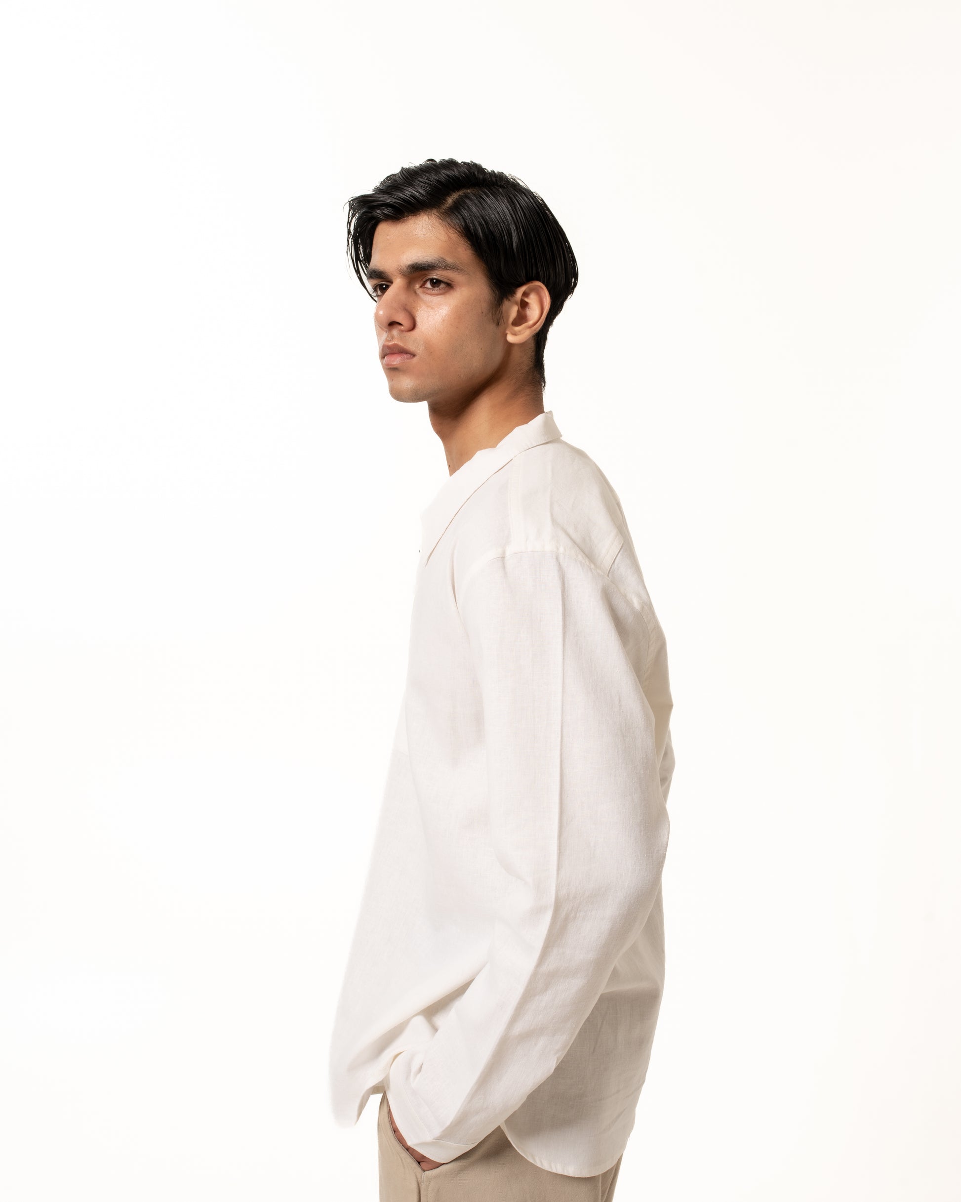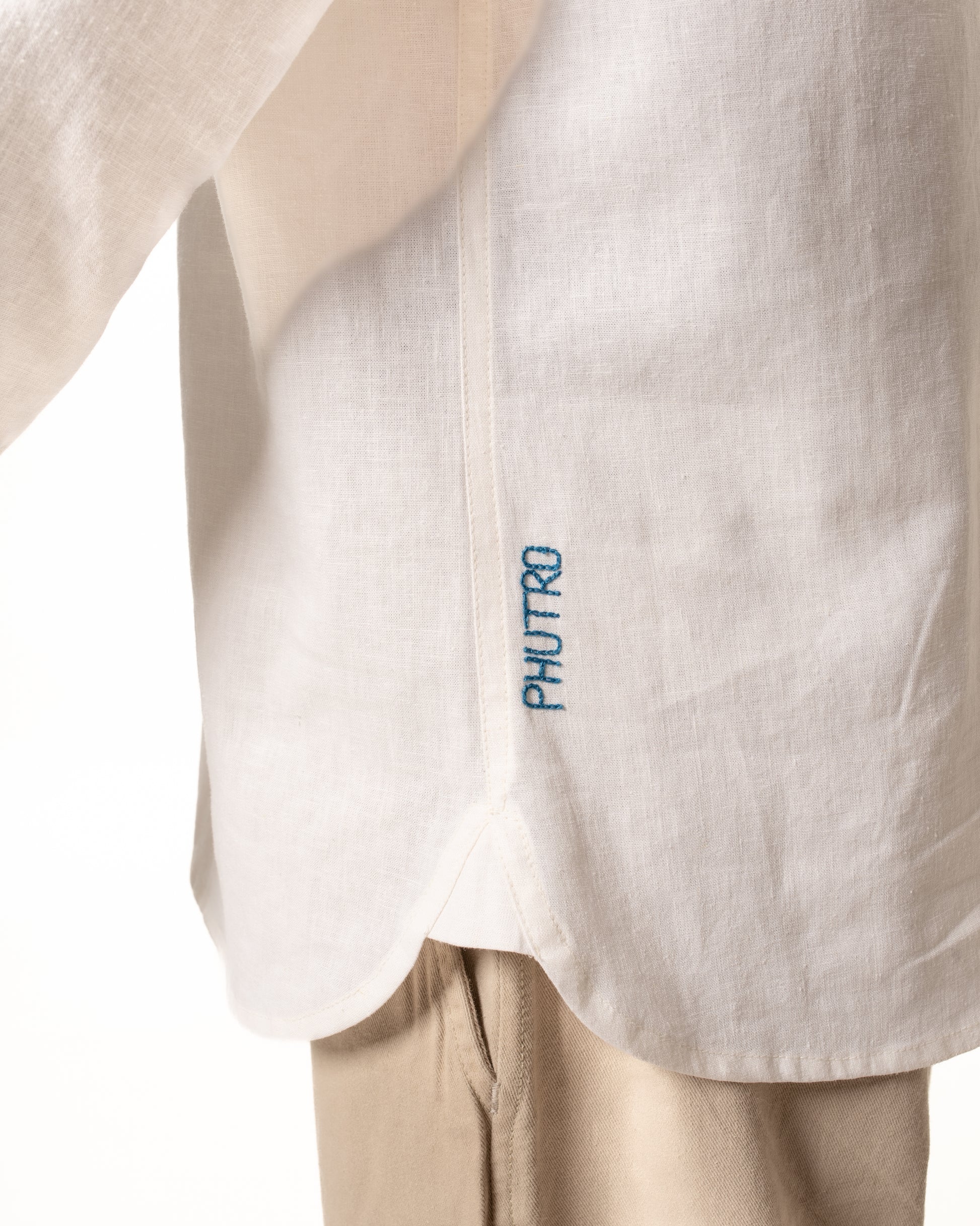 This shirt is made from handwoven linen, woven slowly on traditional looms by skilled weavers. The process—from spinning the yarn to weaving the fabric—takes time and care. Handwoven linen has a soft texture and natural feel, with small irregularities that reflect its handmade nature.