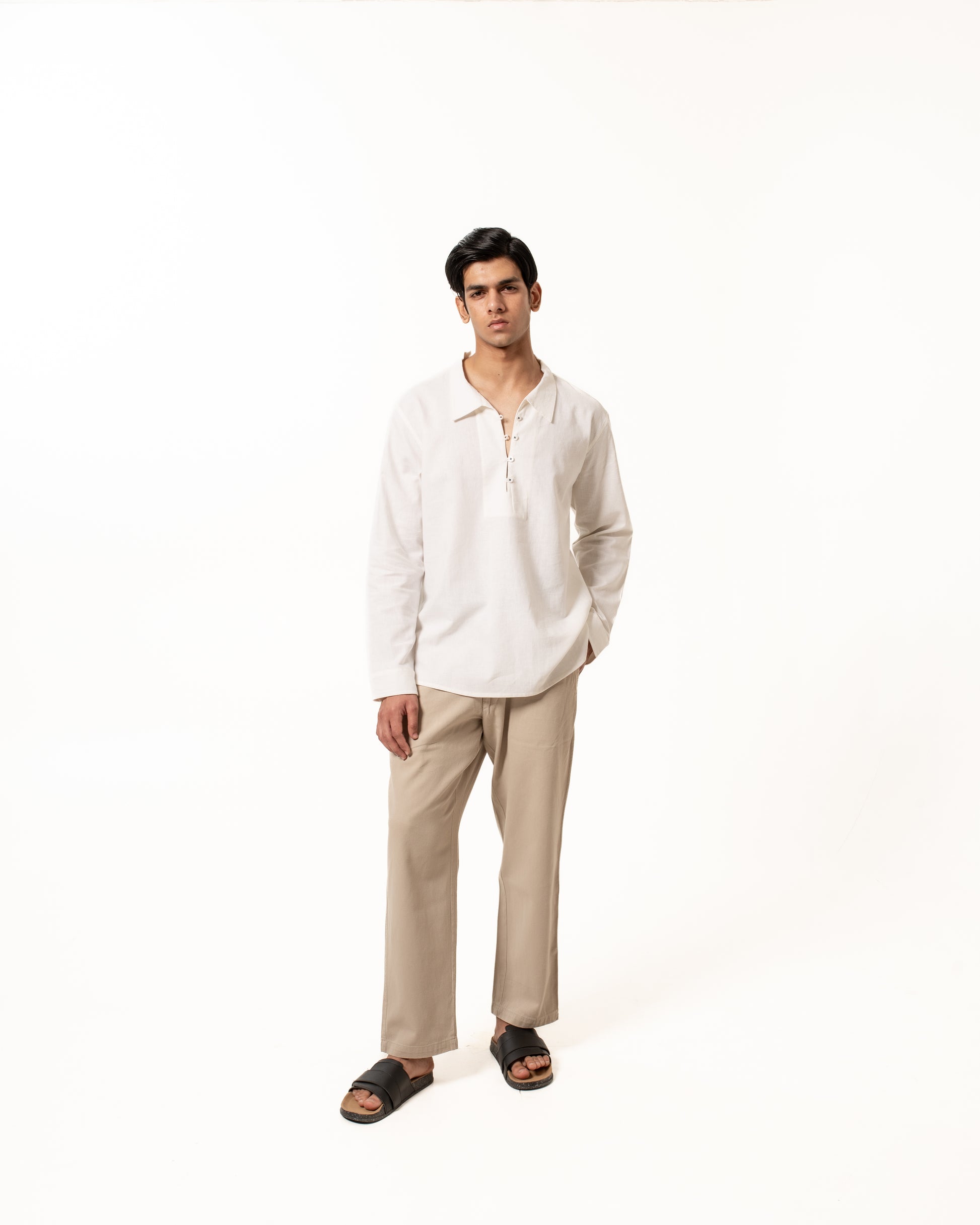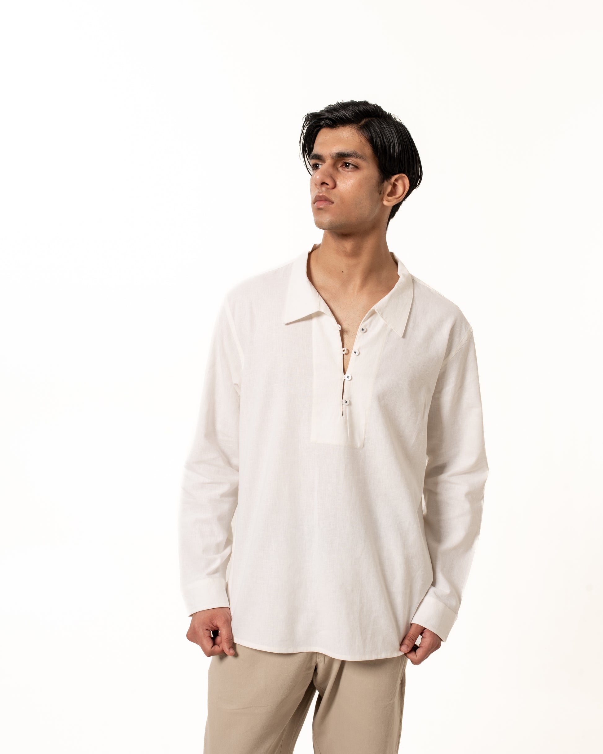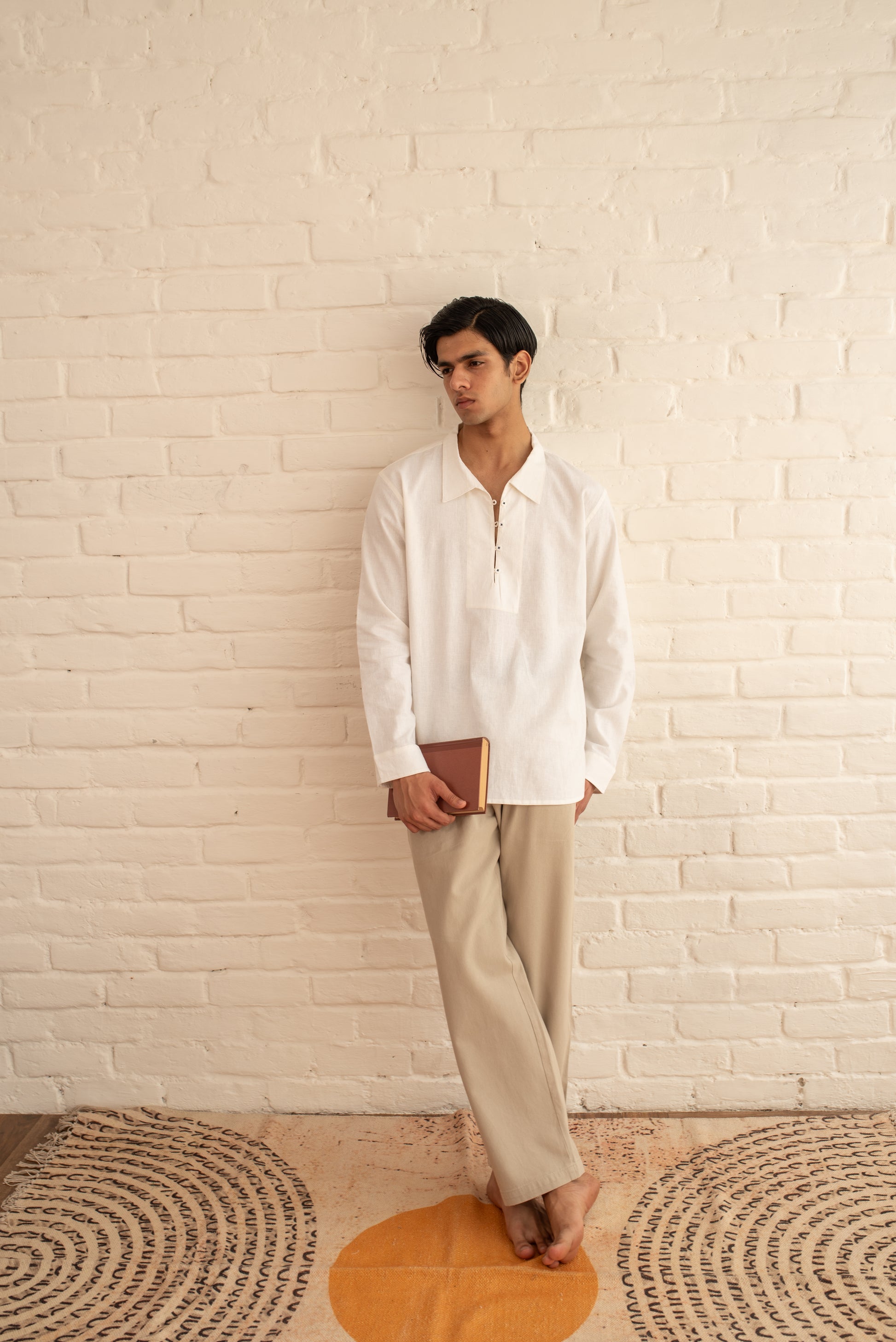 This shirt is made from handwoven linen, woven slowly on traditional looms by skilled weavers. The process—from spinning the yarn to weaving the fabric—takes time and care. Handwoven linen has a soft texture and natural feel, with small irregularities that reflect its handmade nature.