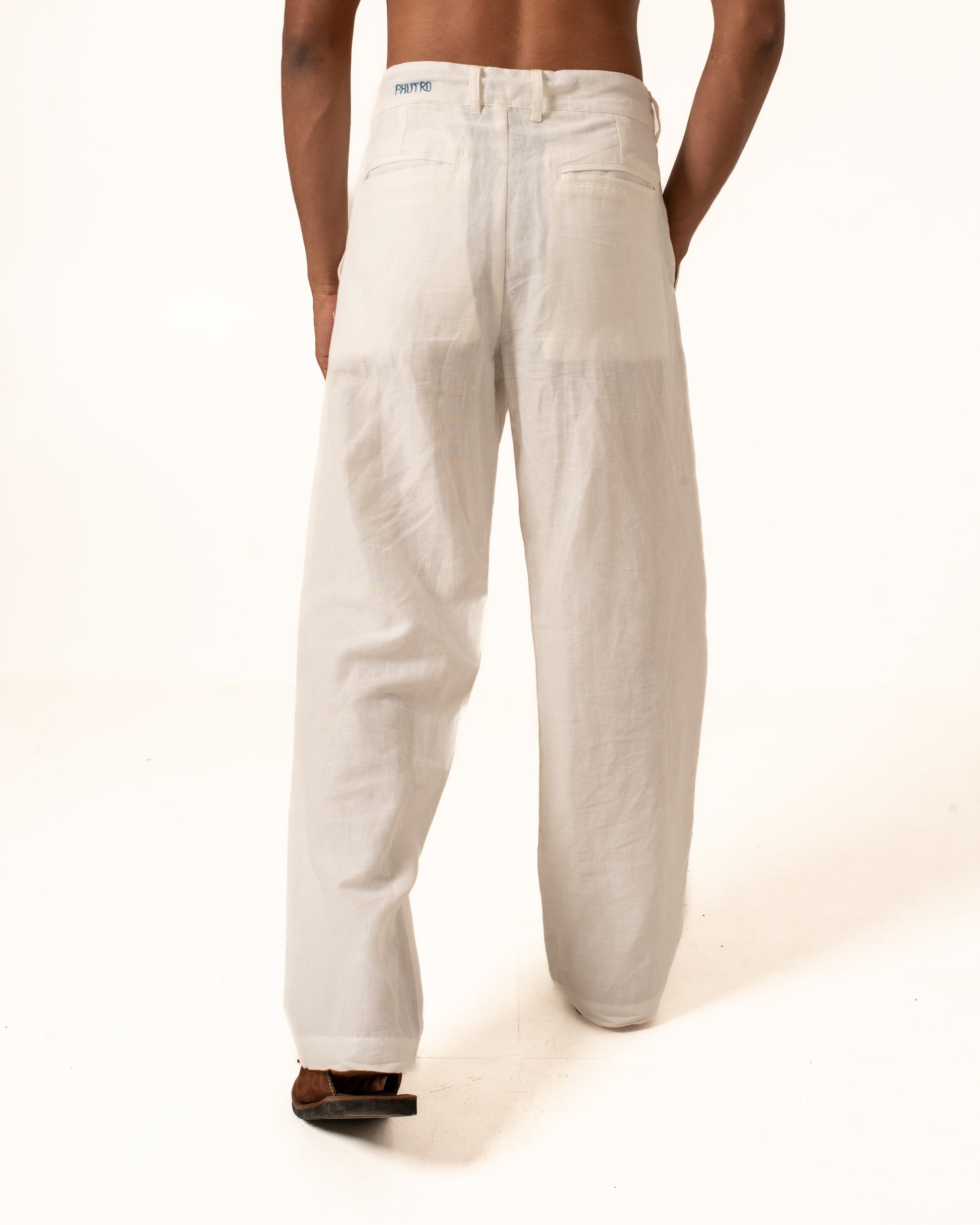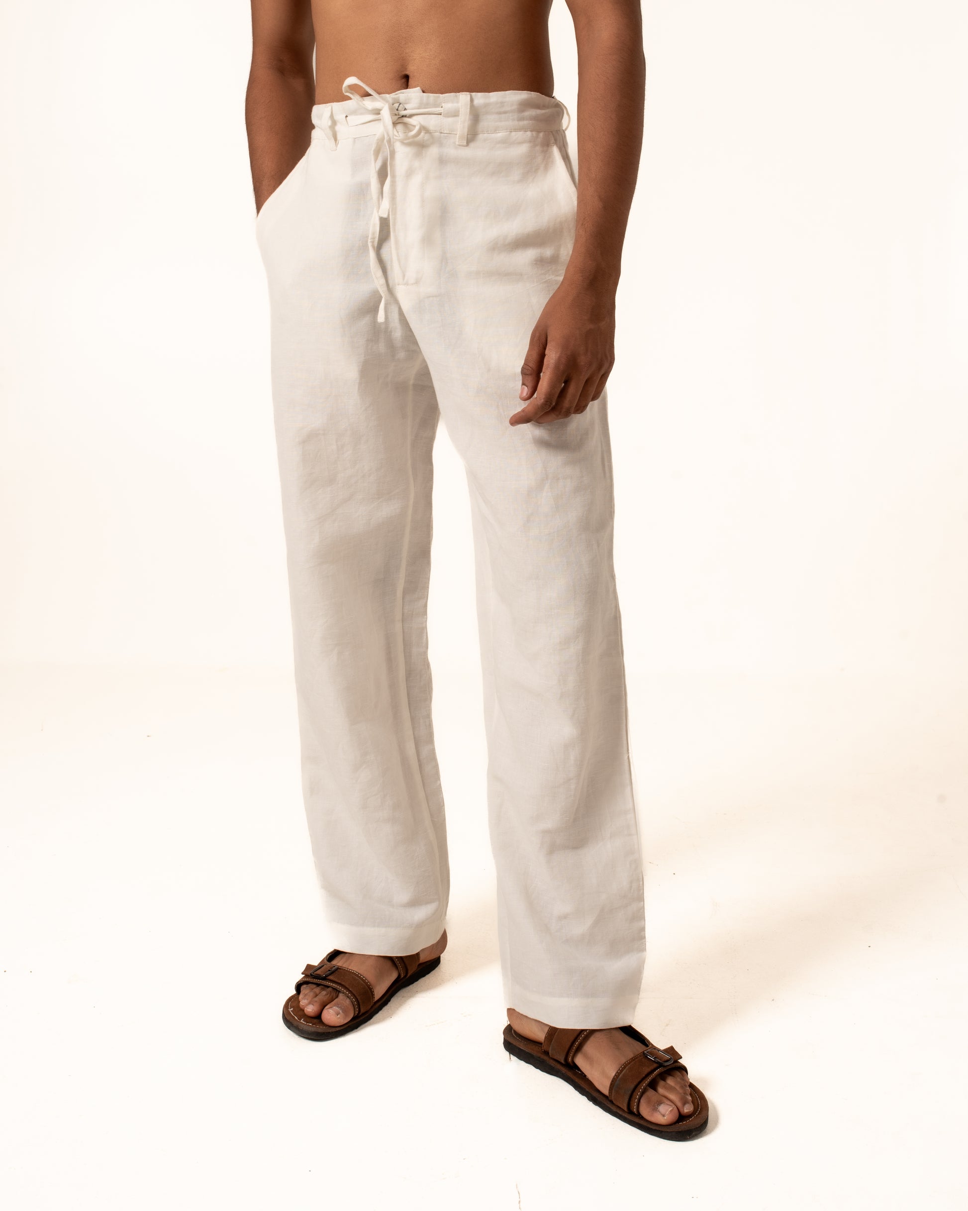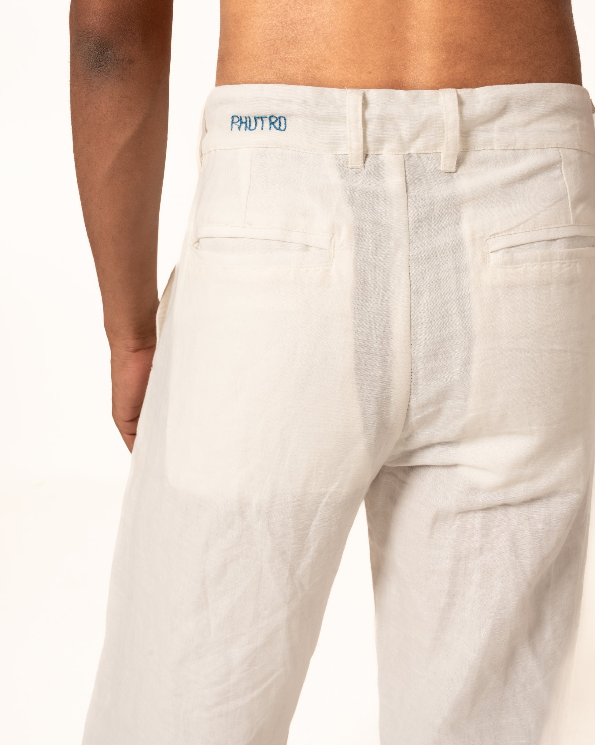 This pant is made from handwoven linen, woven slowly on traditional looms by skilled weavers. The process—from spinning the yarn to weaving the fabric—takes time and care. Handwoven linen has a soft texture and natural feel, with small irregularities that reflect its handmade nature.