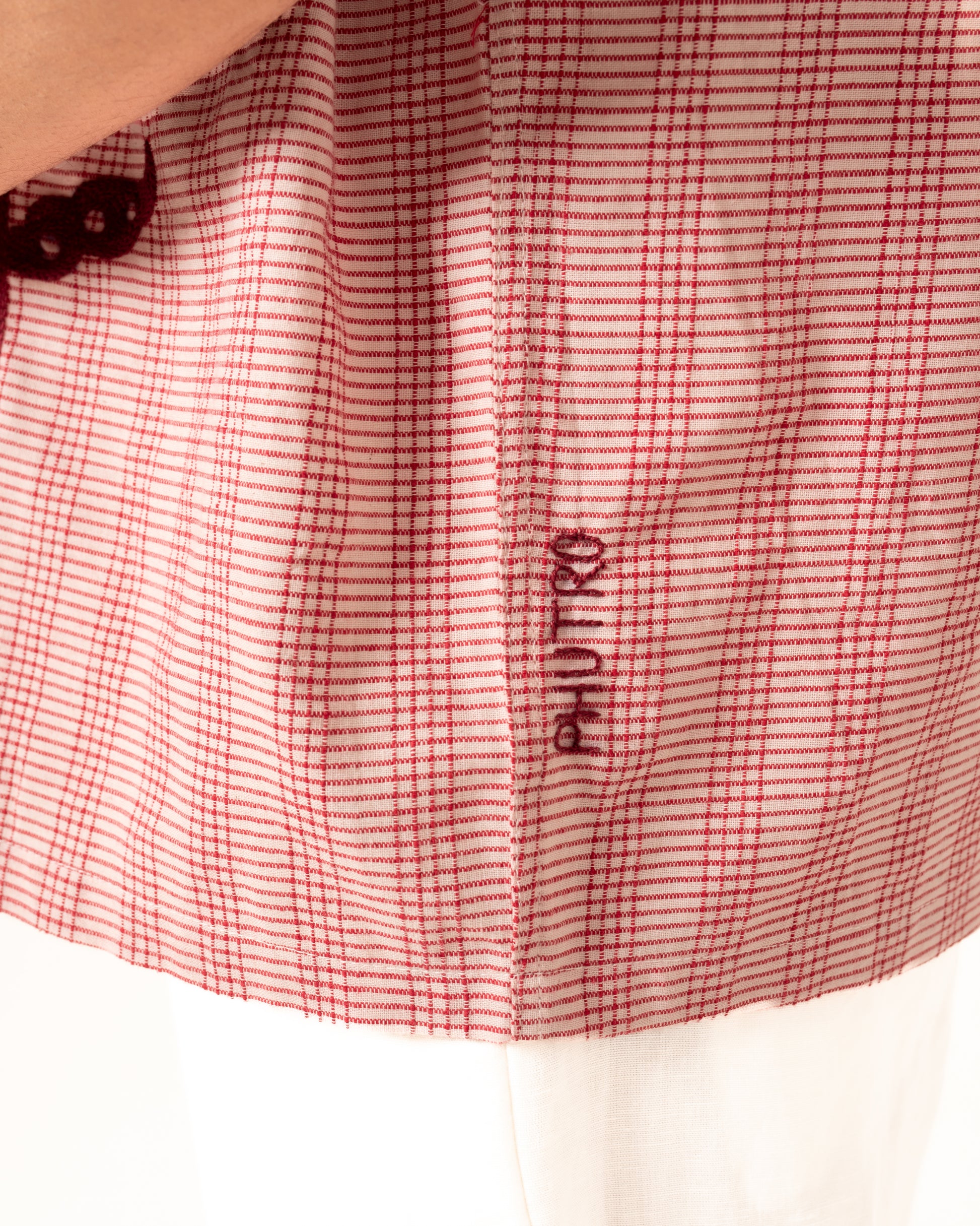 This handwoven khadi cotton shirt is crafted by skilled artisans at the PHUTRO Workshop, with each piece taking several days to complete. The cotton is hand-spun using a charkha and woven on traditional looms, reflecting a slow, mindful process. Once the fabric is ready, artisans hand-mark the design and carefully embroider each motif stitch by stitch, dedicating hours a day to ensure precision. The result is a unique, breathable shirt that showcases true craftsmanship, combining the art of handwoven fabric and intricate hand embroidery.